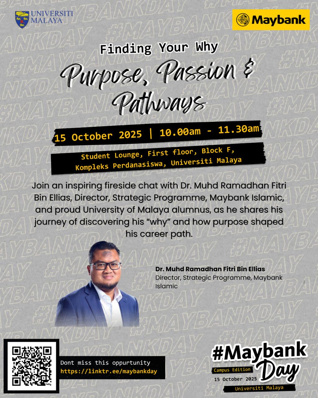 Join an inspiring fireside chat with Dr. Muhd Ramadhan Fitri Bin Ellias, Director, Strategic Programme, Maybank Islamic — and proud UM alumnus — as he shares his journey of discovering his “why” and how purpose shaped his career path. 💛