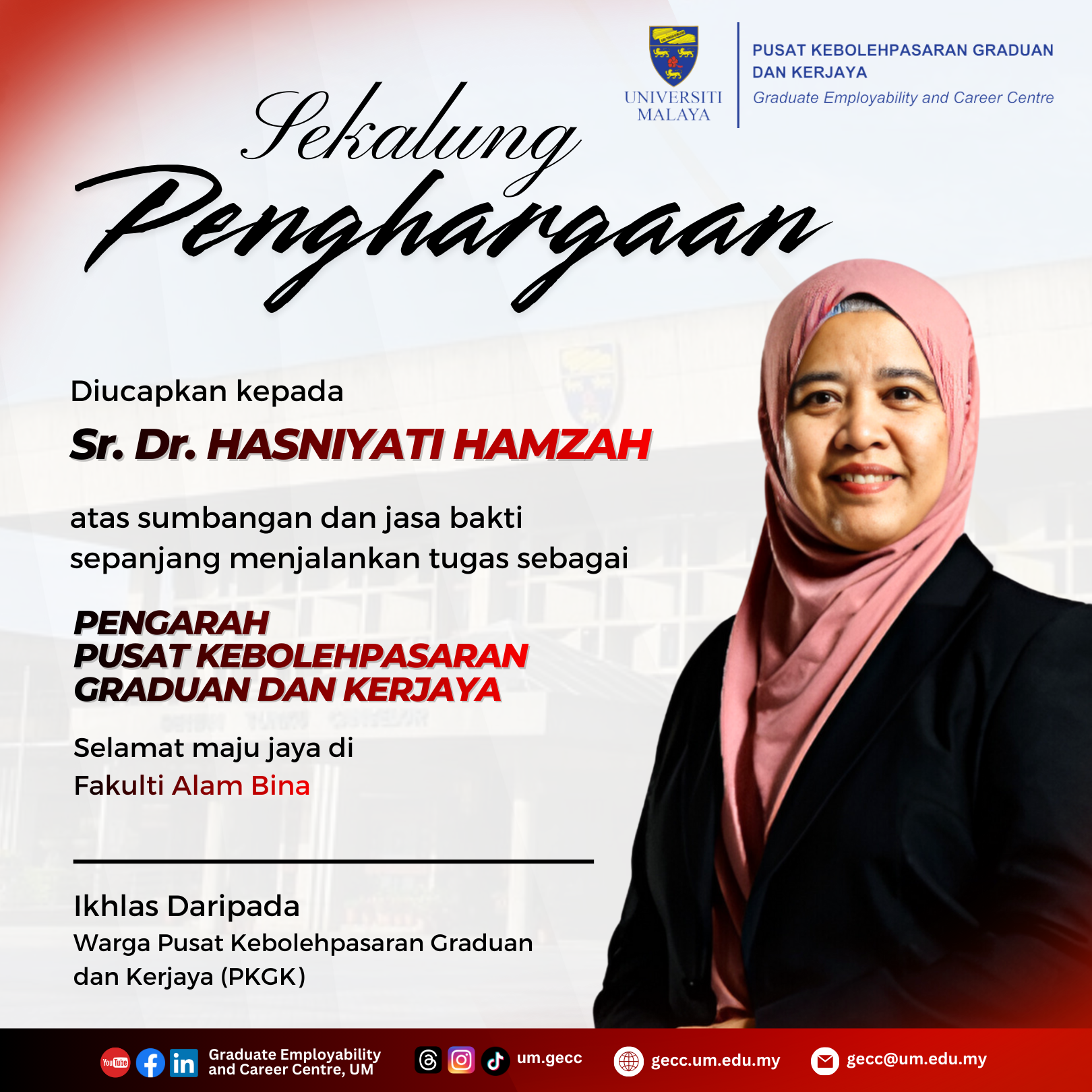 Pusat Kebolehpasaran Graduan dan Kerjaya merakamkan setinggi-tinggi terima kasih kepada Sr. Dr. Hasniyati Hamzah Mantan Pengarah, Pusat Kebolehpasaran Graduan & Kerjaya yang telah menyumbang bakti, keringat, idea dan dedikasi selama berkhidmat di sini. Sumbangan beliau sangat tidak ternilai dan budi yang ditaburkan akan dikenang sepanjang zaman. Banyak sumbangan dan pembaharuan yang telah dilaksanakan bagi meningkatkan kebolehpasaran pelajar UM.