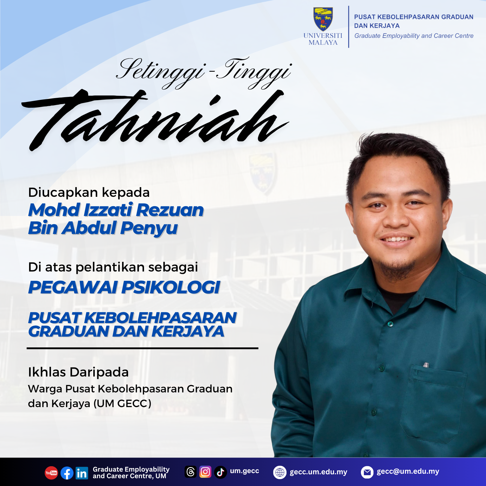 Pusat Kebolehpasaran Graduan dan Kerjaya merakamkan setinggi-tinggi tahniah dan selamat datang kepada Encik Mohd Izzati Rezuan Bin Abdul Penyu sebagai Pegawai Psikologi Pusat Kebolehpasaran Graduan dan Kerjaya.